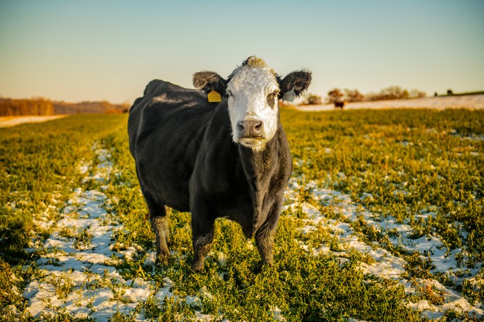 Farmer John Snyder takes great pride in the breeding of his beef cows. He puts his animals on rotating pastures year-round, and in the winter they get hay and some of his own non-GMO grain as a supplement. His beef when sold commercially regularly grades as Prime and Choice.